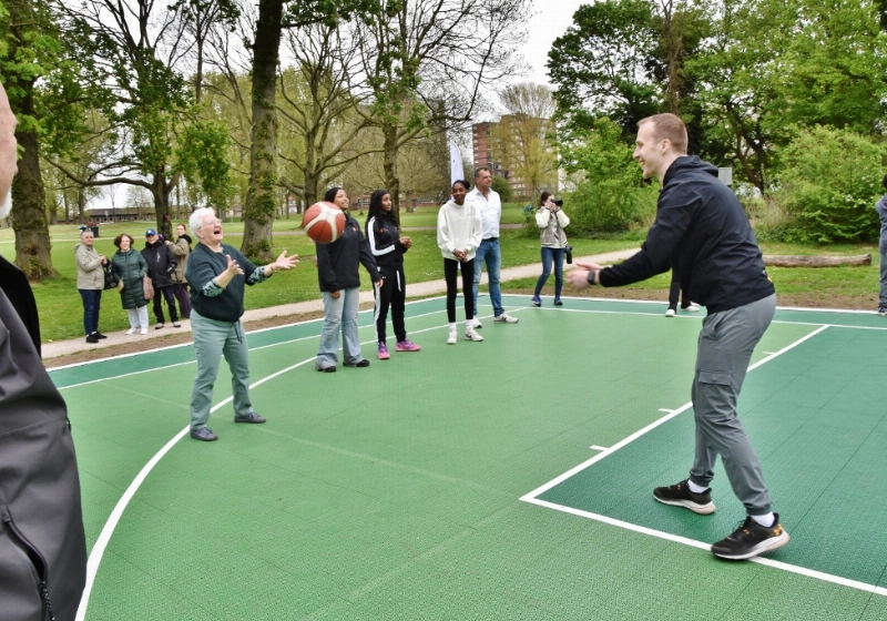 Mieke Wigmans van Jongeren & Senioren had de wens van Huiskens gehoord en pikte het op, bracht het onder de aandacht van deze en gene en ruim drie jaar later is het basketbalveld realiteit. Zij was een van de mensen die vanmiddag het woord voerde tijdens de feestelijke opening. Ook De Groot deed dat. De teams Flaming Knights en Mythical Dolphins van Yets Foundation verzorgden een clinic. En Liesbeth van Duijn maakte de foto's.